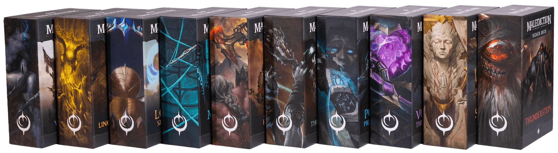 Everything two players need to learn Malediction and play a full match right away. Jump into a ready-to-play Seeker showdown with a Two-Player Starter Box built for a smooth first game and easy replay. Each box includes two opposing Seekers with their starter decks, plus core play essentials such as a redeem code for STL files, standees and bases, punchboards and tokens, a D20, a quick guide, a lore leaflet, a paper playmat, and a plastic ruler.