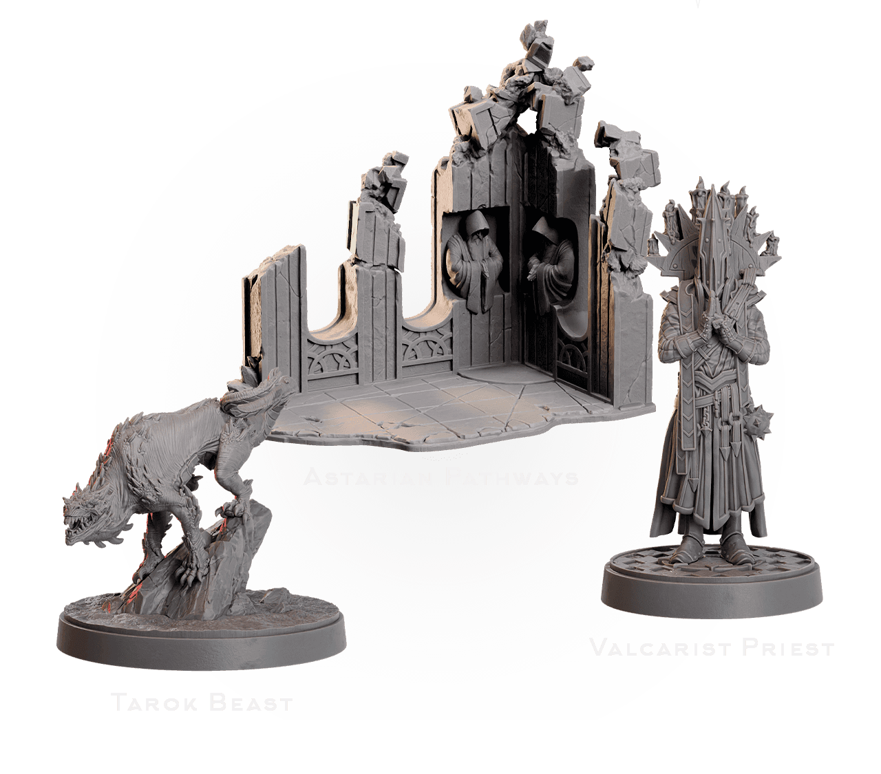 STL bonus: Leaping Tarok Beast, Valcarist Priest, and Astarian Pathways (Small) all pre-supported, pre-oriented, print-ready (resin/FDM).